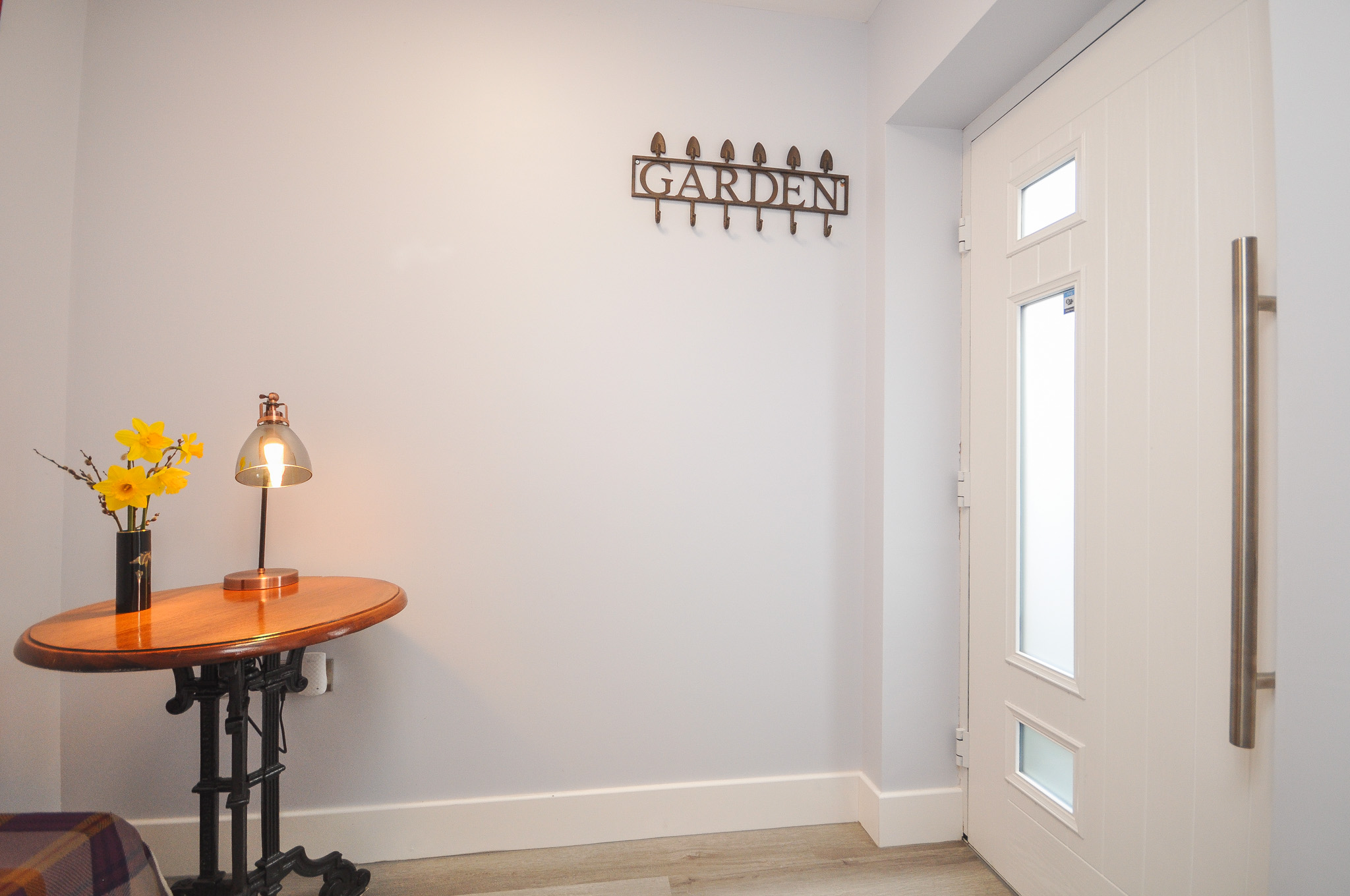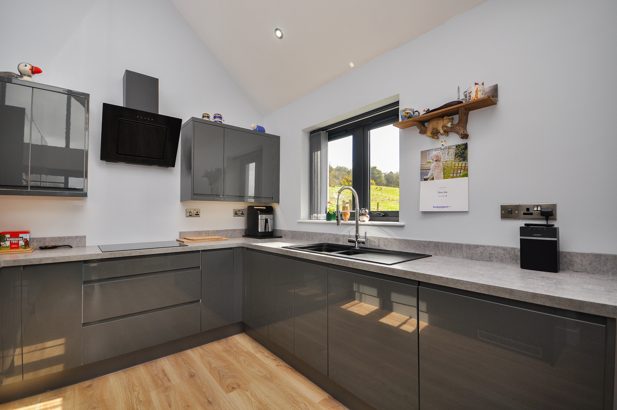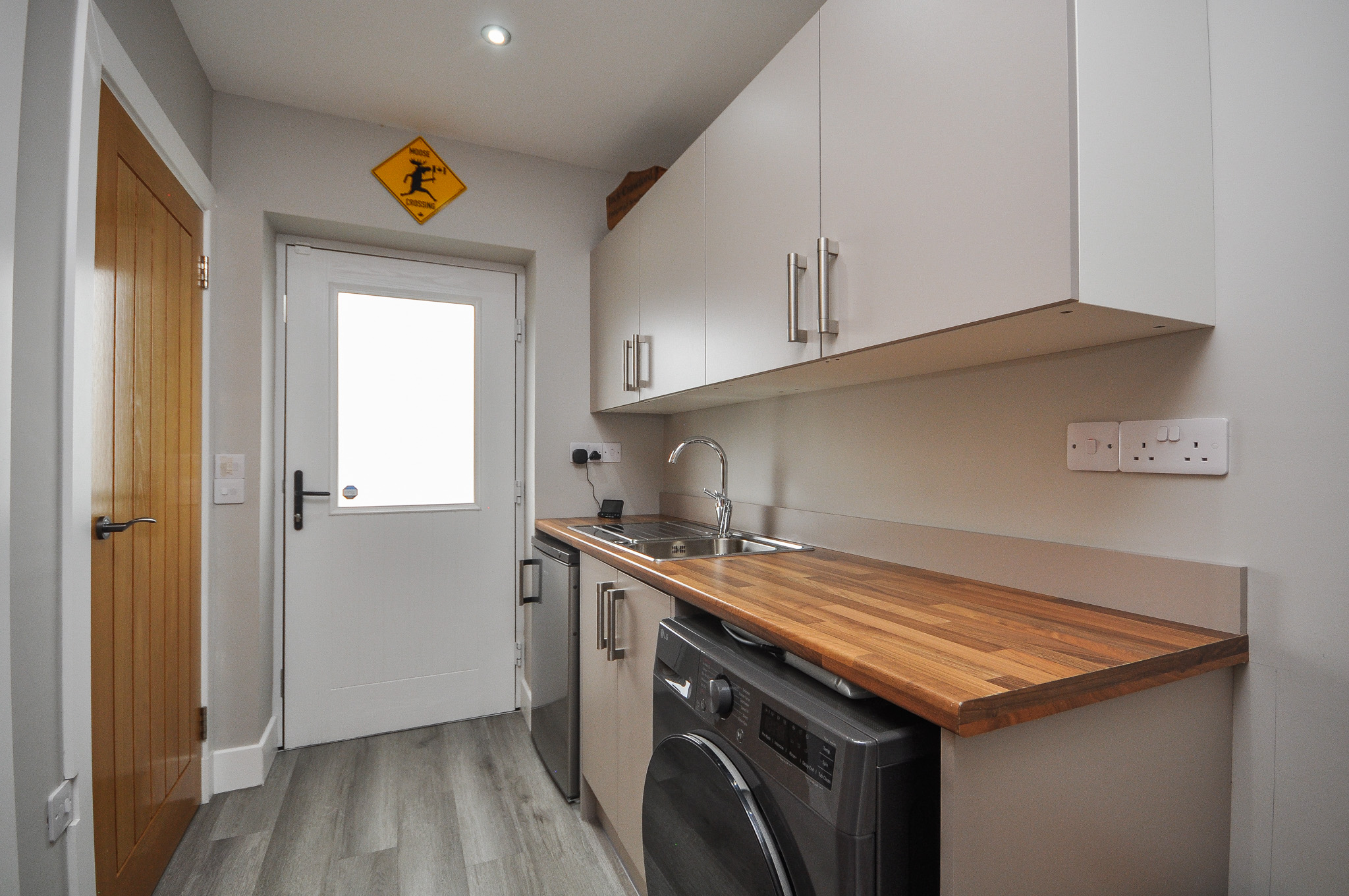 The modern fitted kitchen is finished with high-gloss units complemented by contrasting work surfaces and integrated appliances, providing ample storage and preparation space. A separate utility room offers further fitted units, worktop space, sink and room for laundry appliances, along with convenient external access.