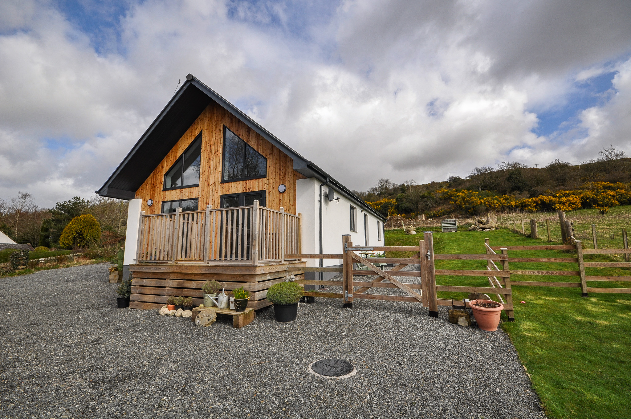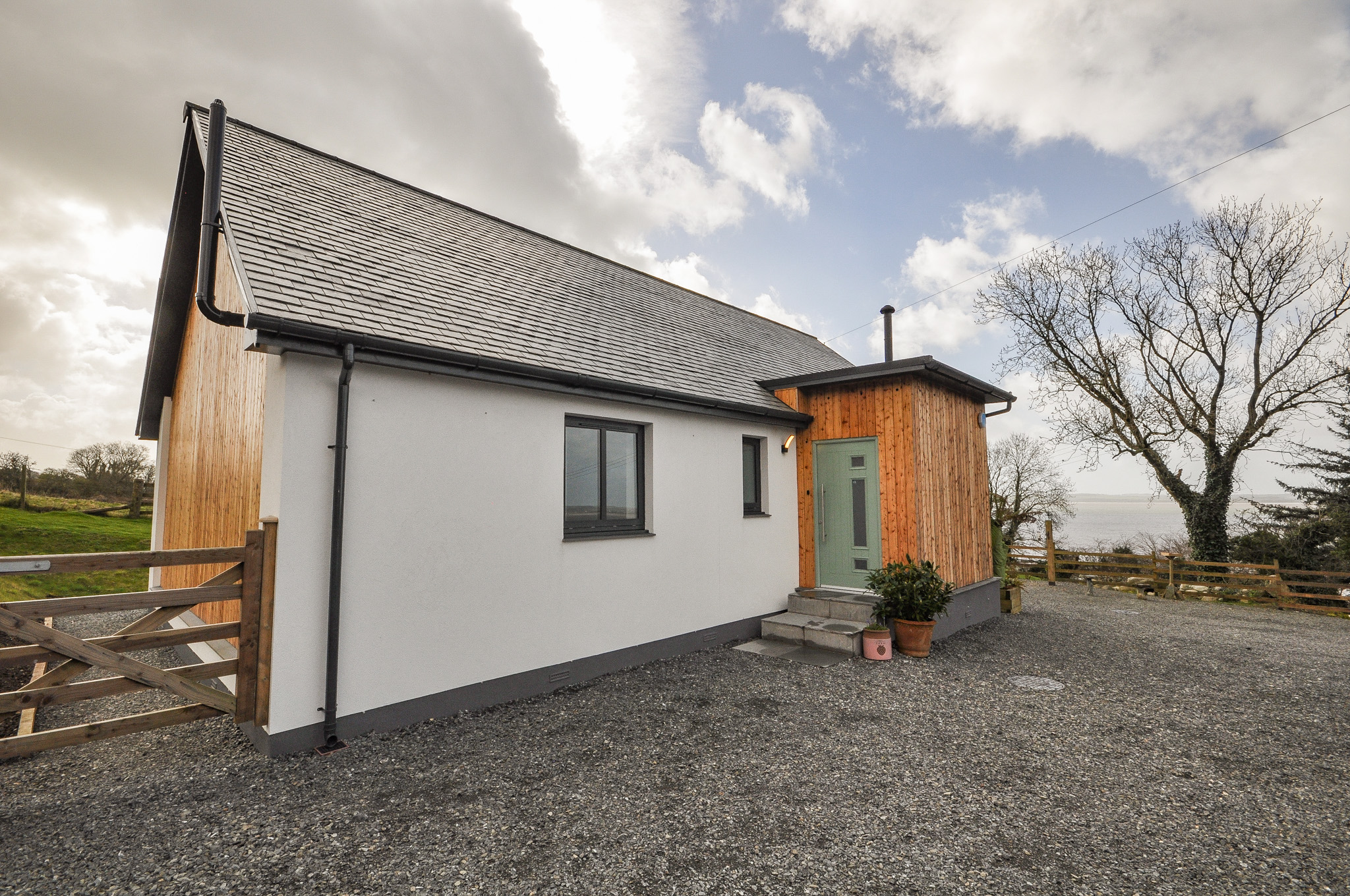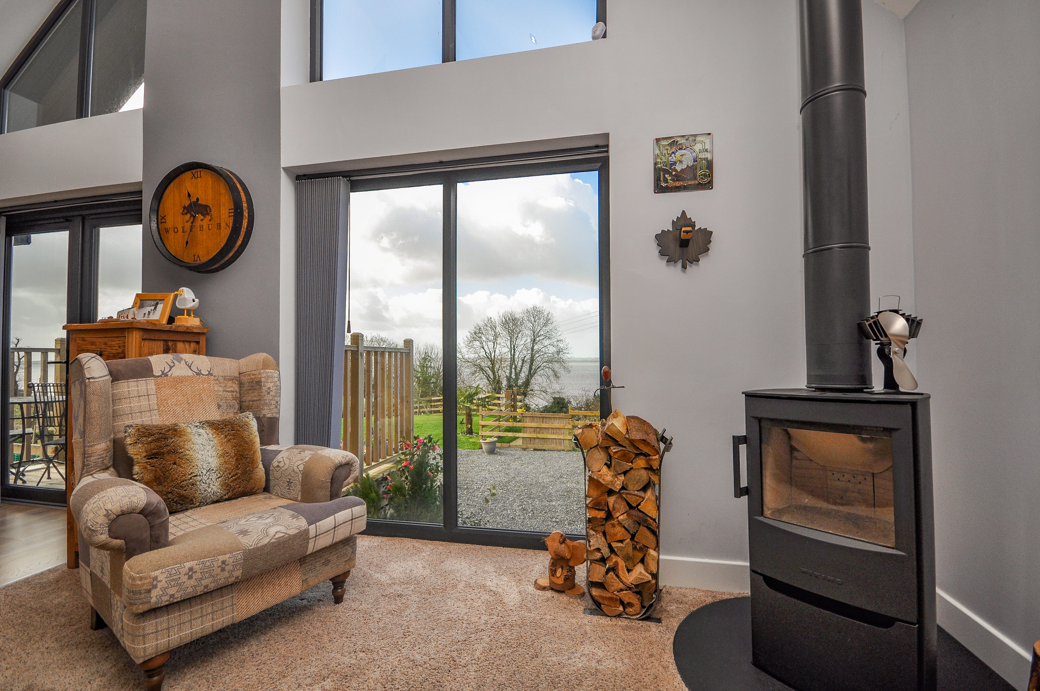 An individually architect-designed modern home, positioned to take full advantage of its elevated setting with attractive open outlooks towards the surrounding countryside and water. Designed with both style and efficiency in mind, the property benefits from modern eco-conscious construction methods including high levels of insulation and extensive glazing, maximising natural light while enhancing heat retention and energy efficiency. The striking exterior combines contemporary render with timber cladding, creating a distinctive and appealing finish.