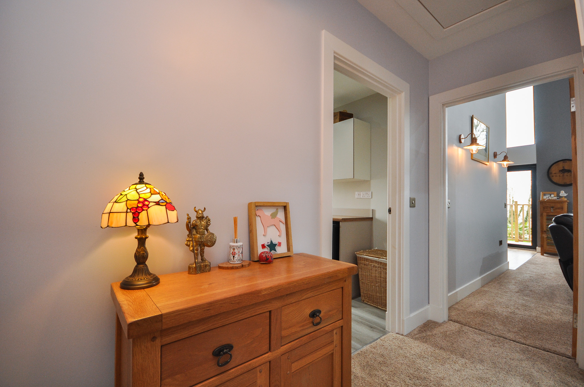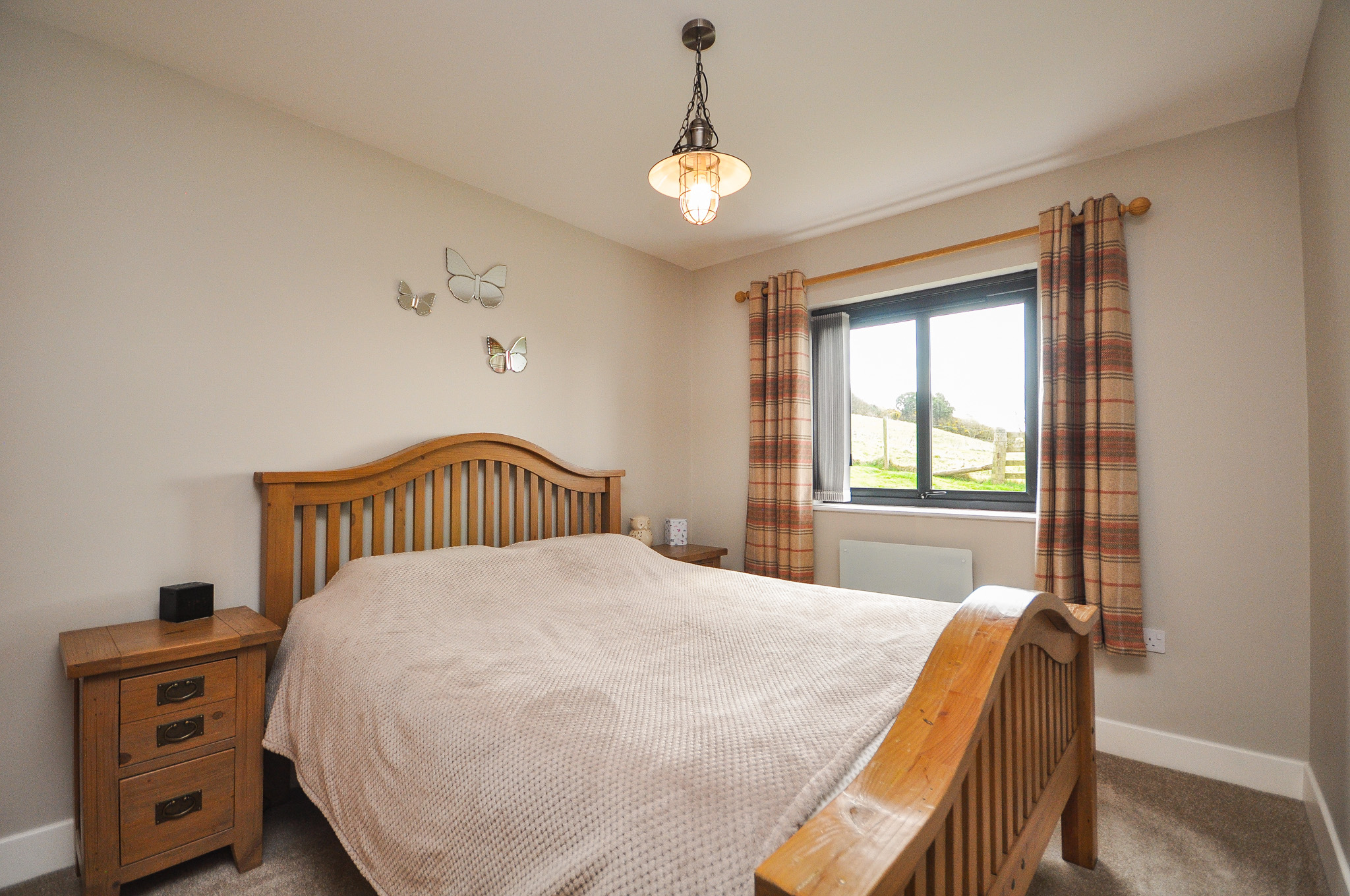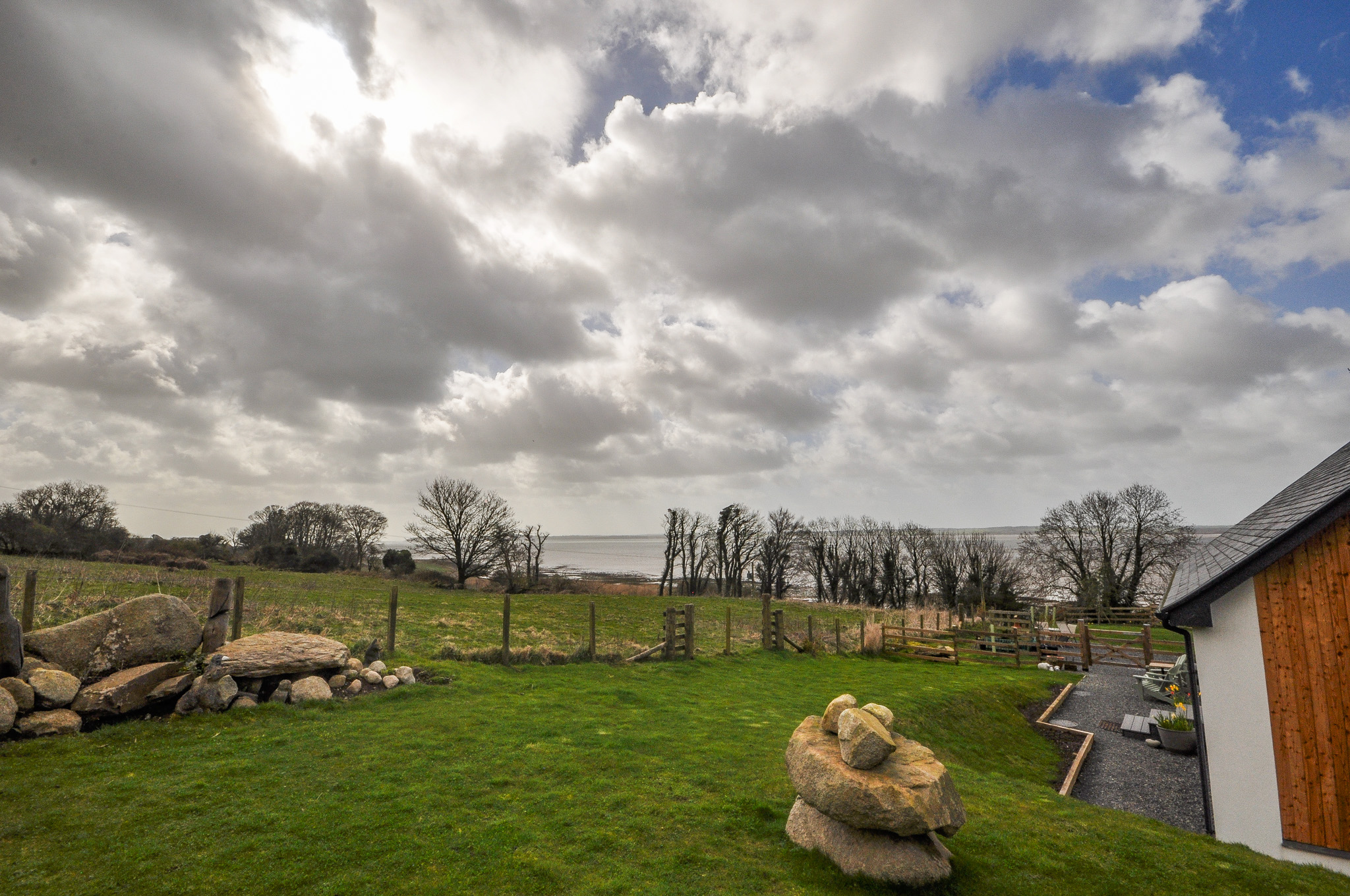 An individually architect-designed modern home, positioned to take full advantage of its elevated setting with attractive open outlooks towards the surrounding countryside and water. Designed with both style and efficiency in mind, the property benefits from modern eco-conscious construction methods including high levels of insulation and extensive glazing, maximising natural light while enhancing heat retention and energy efficiency. The striking exterior combines contemporary render with timber cladding, creating a distinctive and appealing finish.