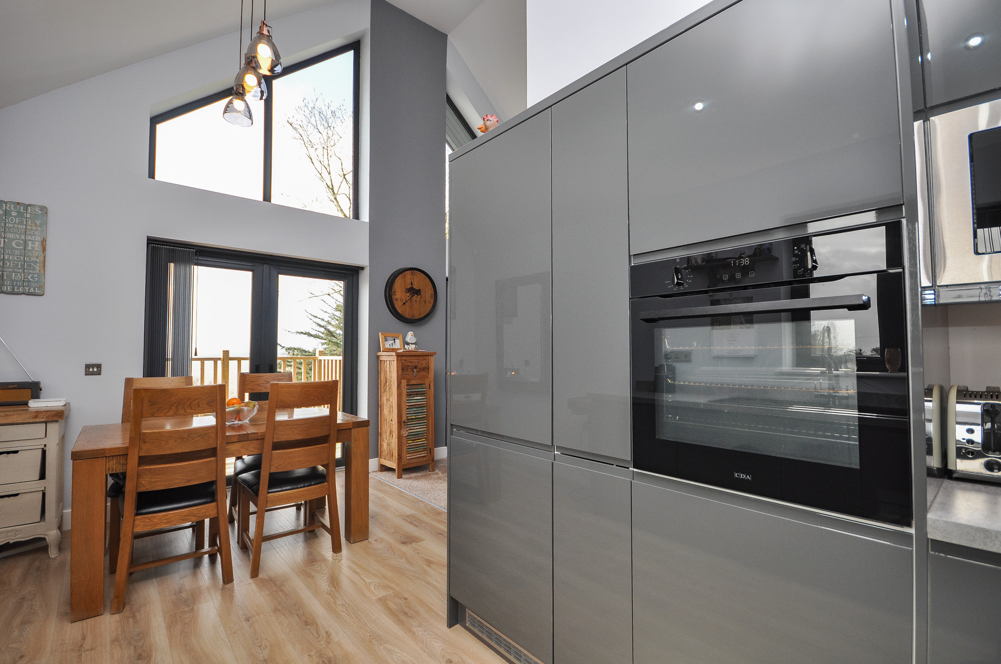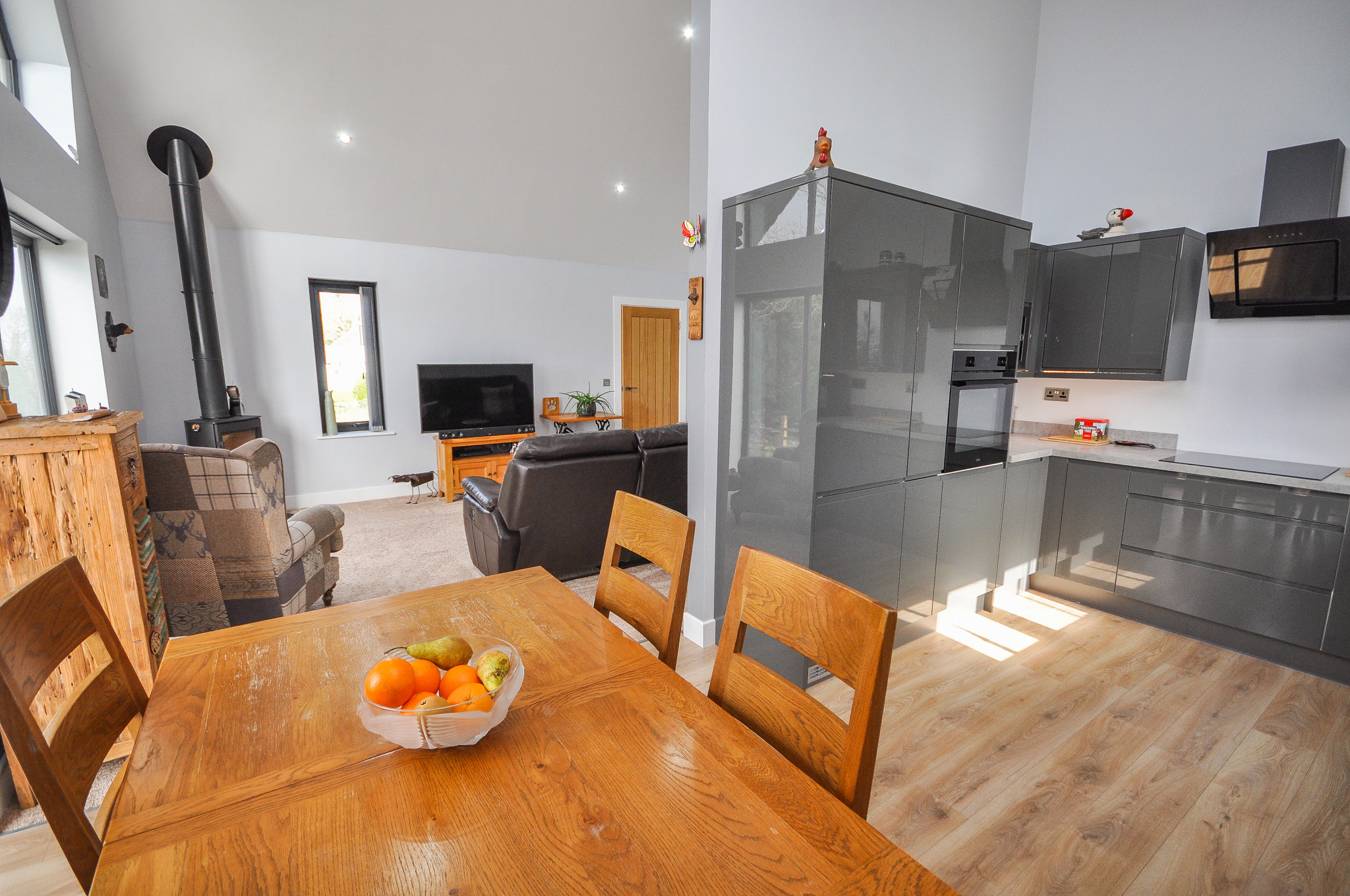 The heart of the home is the impressive open-plan living space, featuring a stunning vaulted ceiling and full-height glazing to the front elevation, framing the outlook and flooding the interior with natural light. A stylish freestanding wood-burning stove provides a cosy focal point, creating a welcoming yet contemporary atmosphere. The living area flows seamlessly into the dining space, which enjoys direct access to the outside, making the layout ideal for both everyday family living and entertaining.