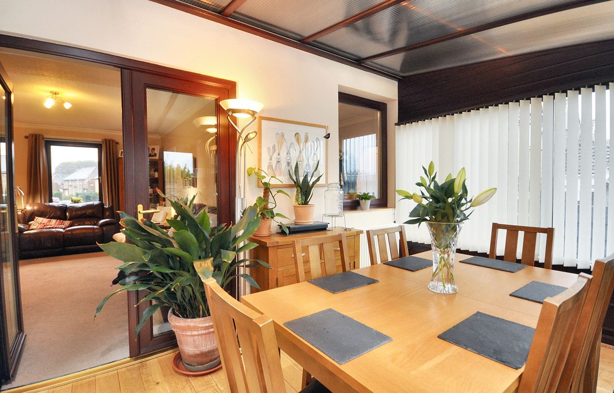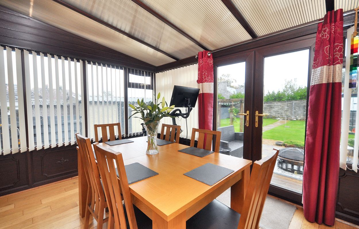 French doors from the conservatory provide seamless access to the outdoors, leading to a tranquil setting featuring a wooden decking patio area, paved patio, and a sprawling lawn meticulously maintained. The gravel border adds a touch of elegance, while timber fencing and a stone dyke wall ensure privacy and security. With the addition of a greenhouse and storage containers, green-fingered enthusiasts will find plenty of space to cultivate their garden. Ample off-road parking is available on the large tarmac driveway to the front, with room for multiple vehicles, complemented by a carport to the side creating a covered entrance to the detached garage, making this property not just a house, but a place to call home with both style and substance.