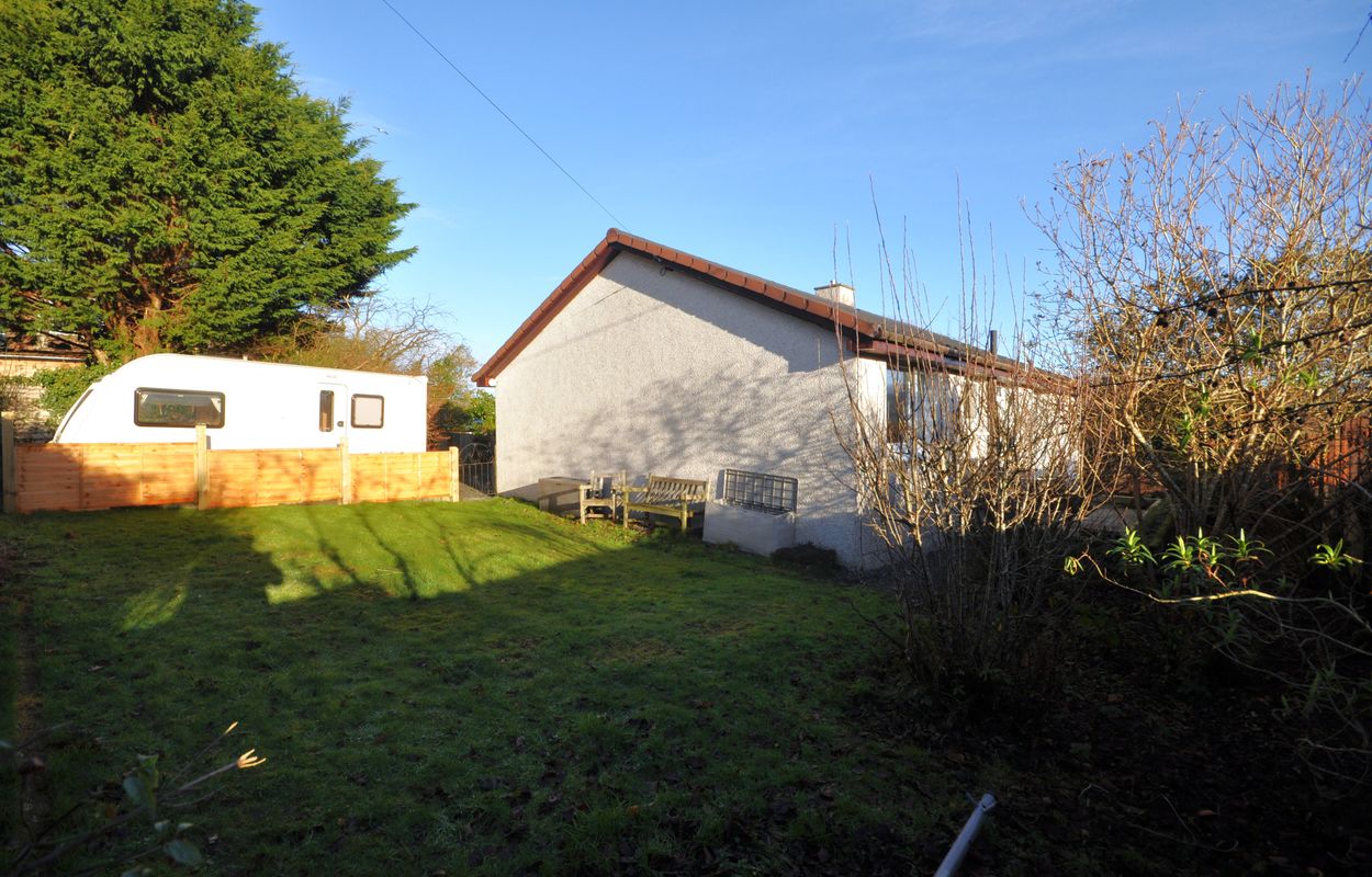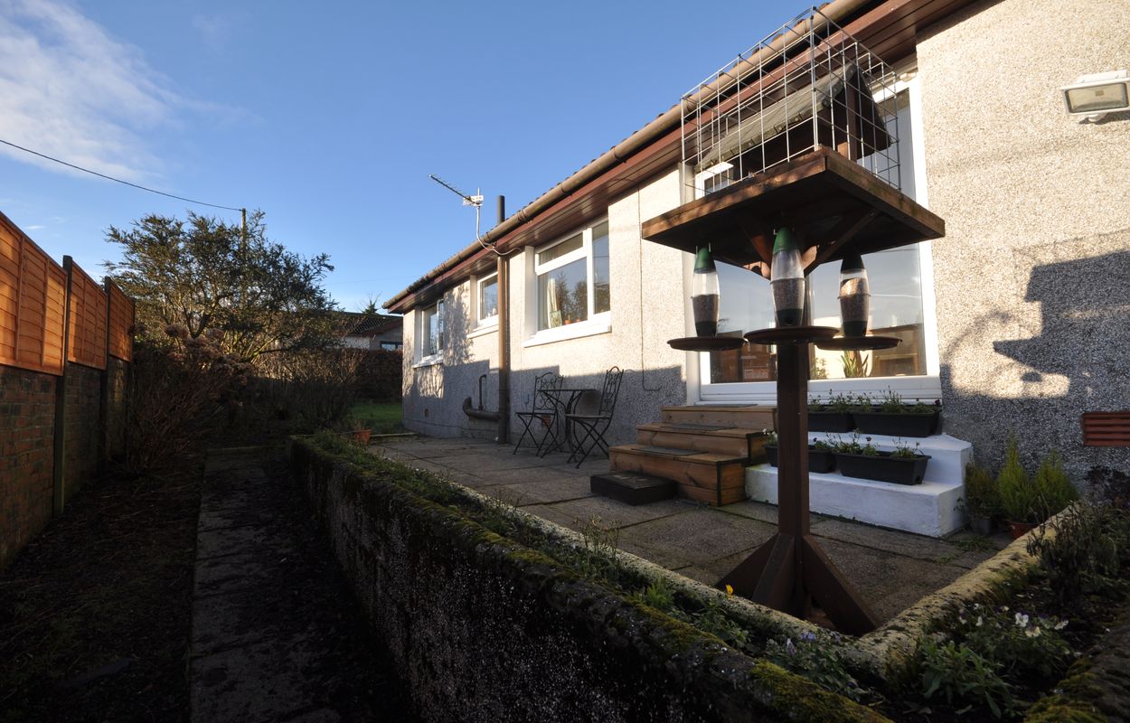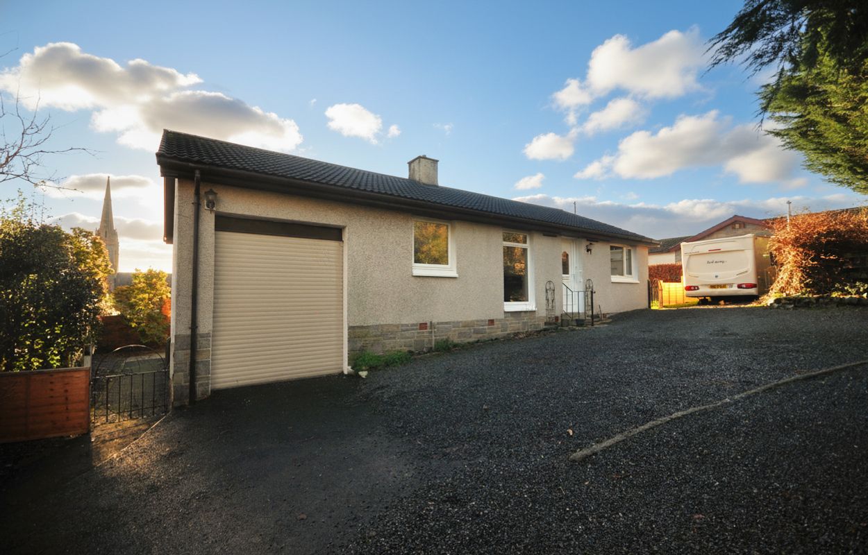 To the side of the property, a large, maintained lawn is bordered by established planting beds and mature hedging, creating a private and tranquil outdoor retreat. A concrete pathway leads around to the rear garden, where a raised concrete patio offers the ideal spot for enjoying the open outlook with views over the Galloway Hills & beyond. The rear garden is further enhanced by planting borders and a sturdy brick wall, providing privacy and a sense of security. At the front of the property, a spacious gravel driveway accommodates multiple vehicles with ease and offers direct access to the integral garage, which features an electric up and over door, brick construction, and a concrete floor. The garage also allows access to a rear utility area and houses the mains power supply and electric metres, ensuring convenience and practicality