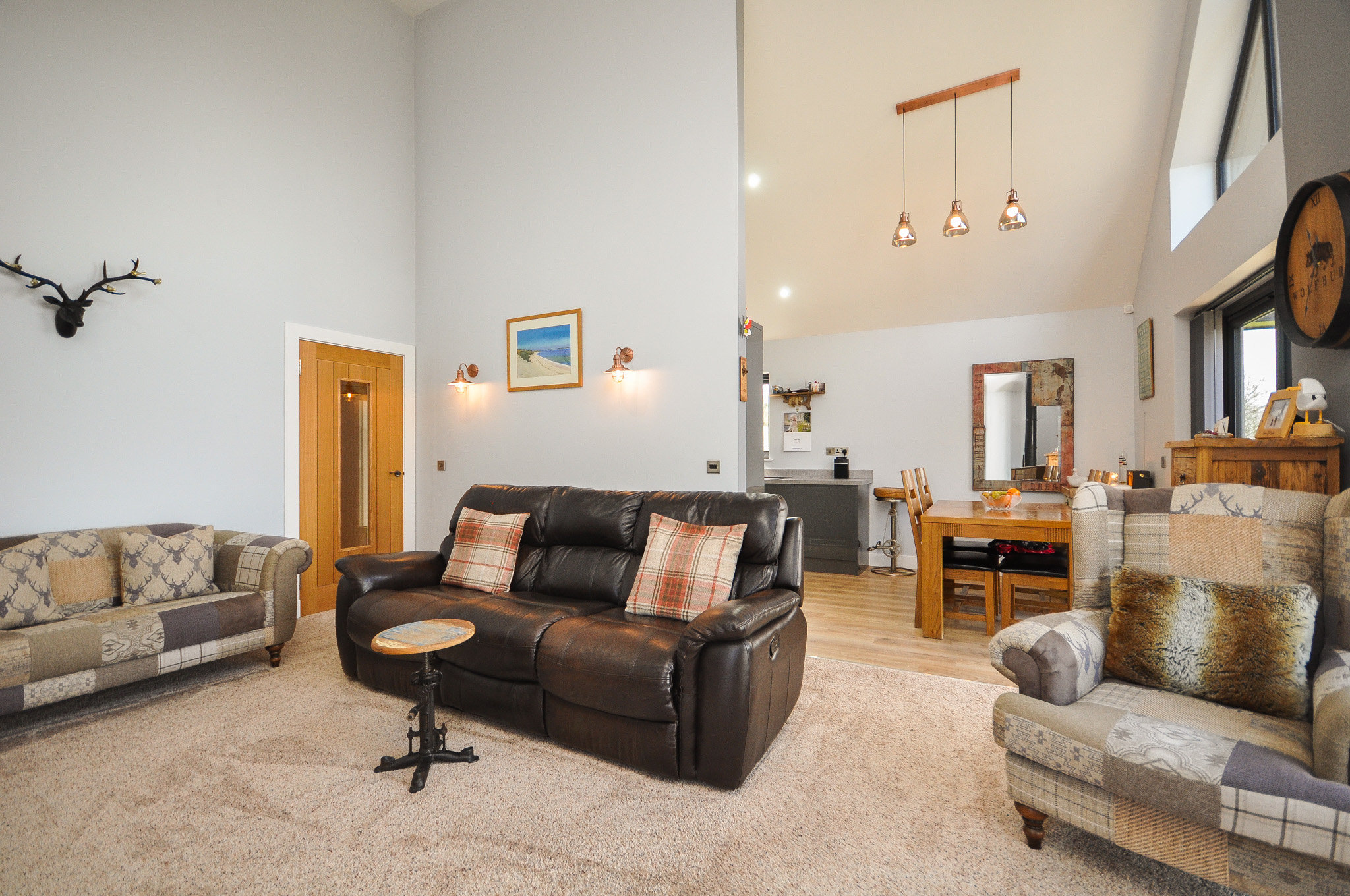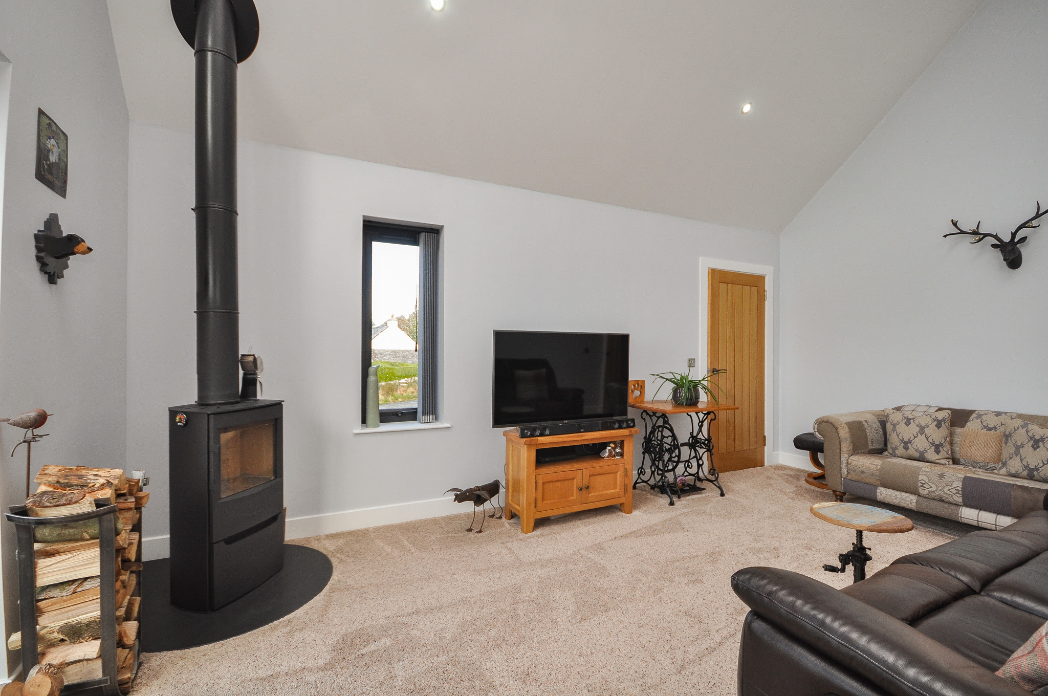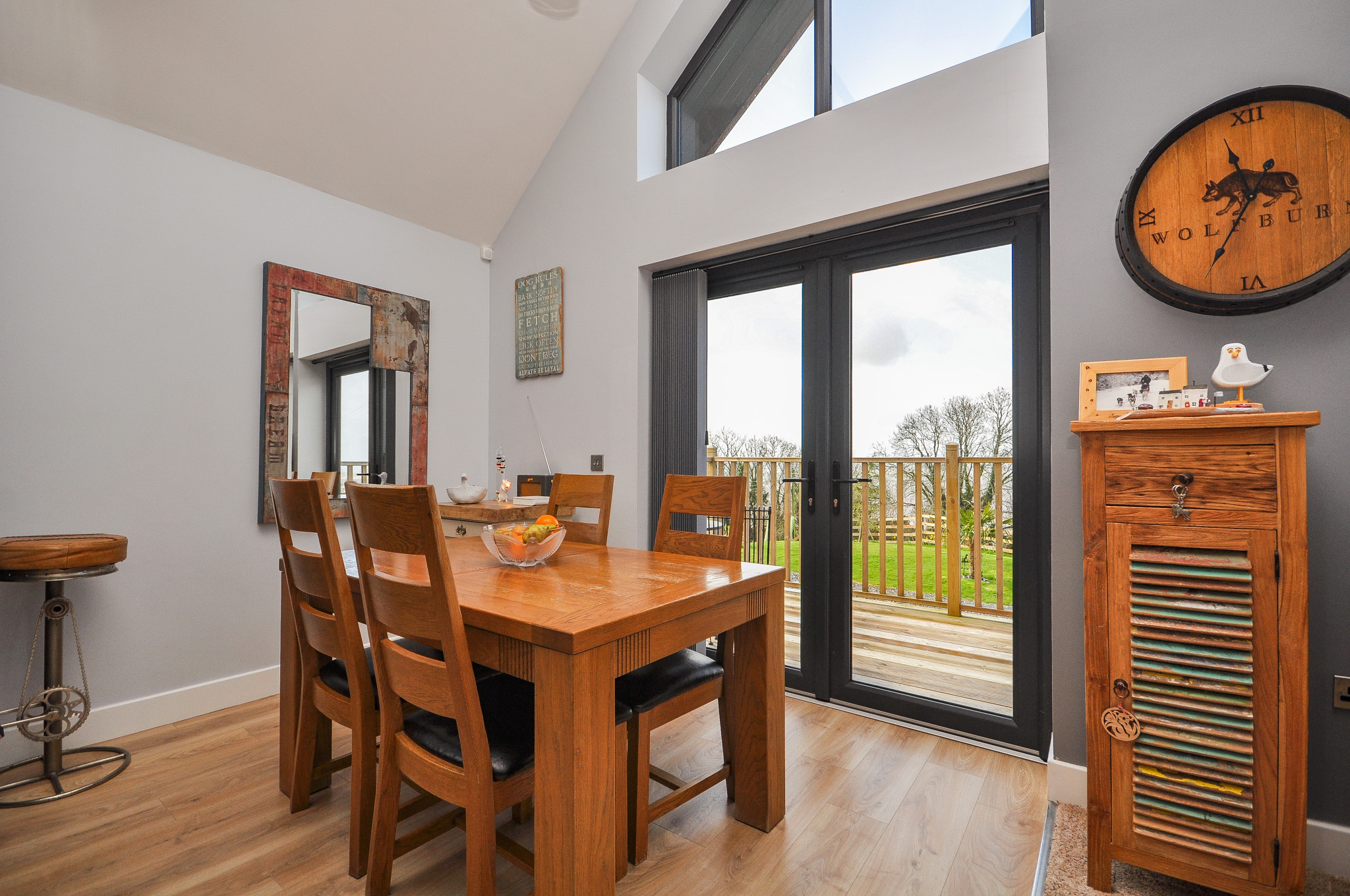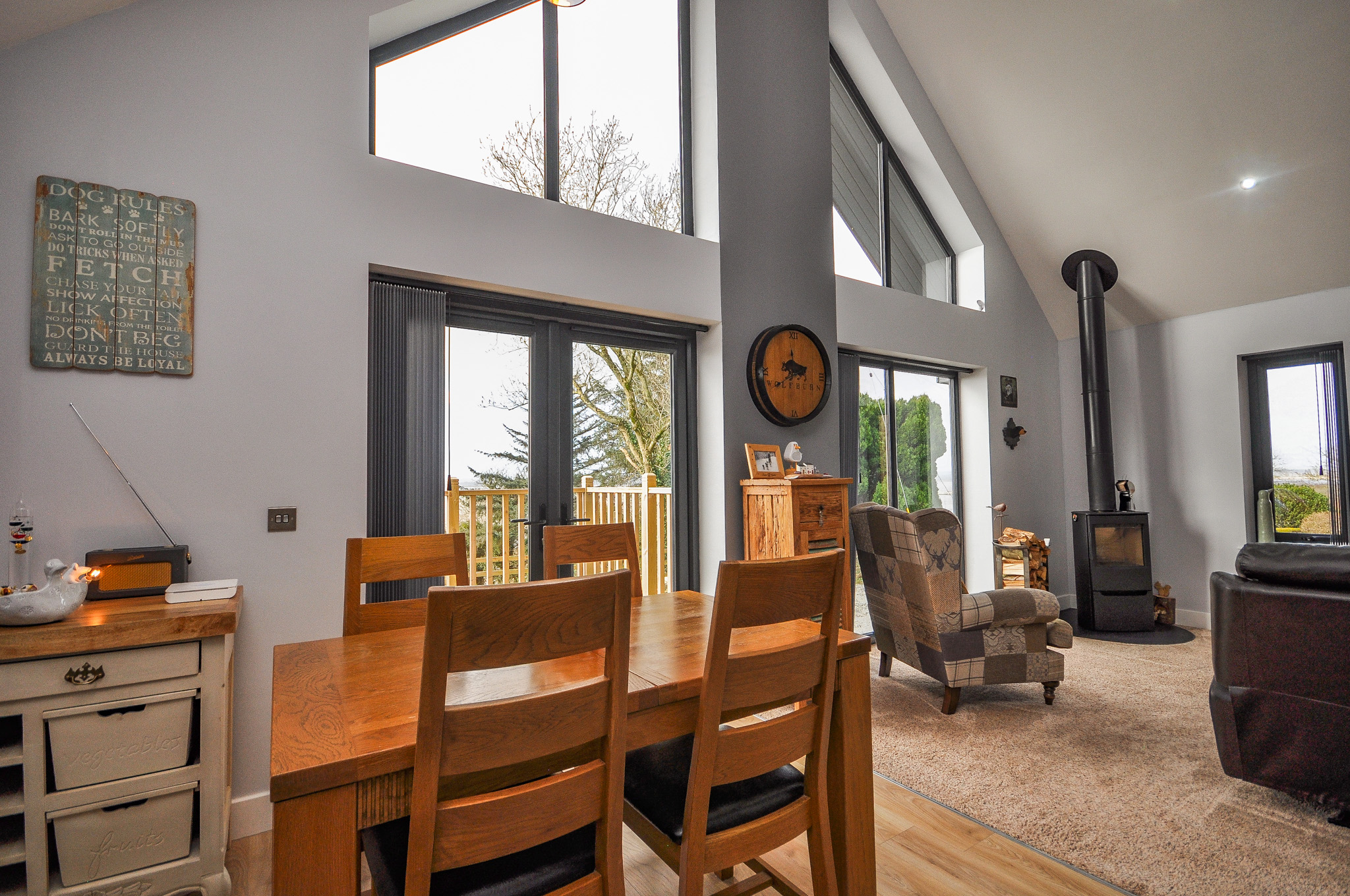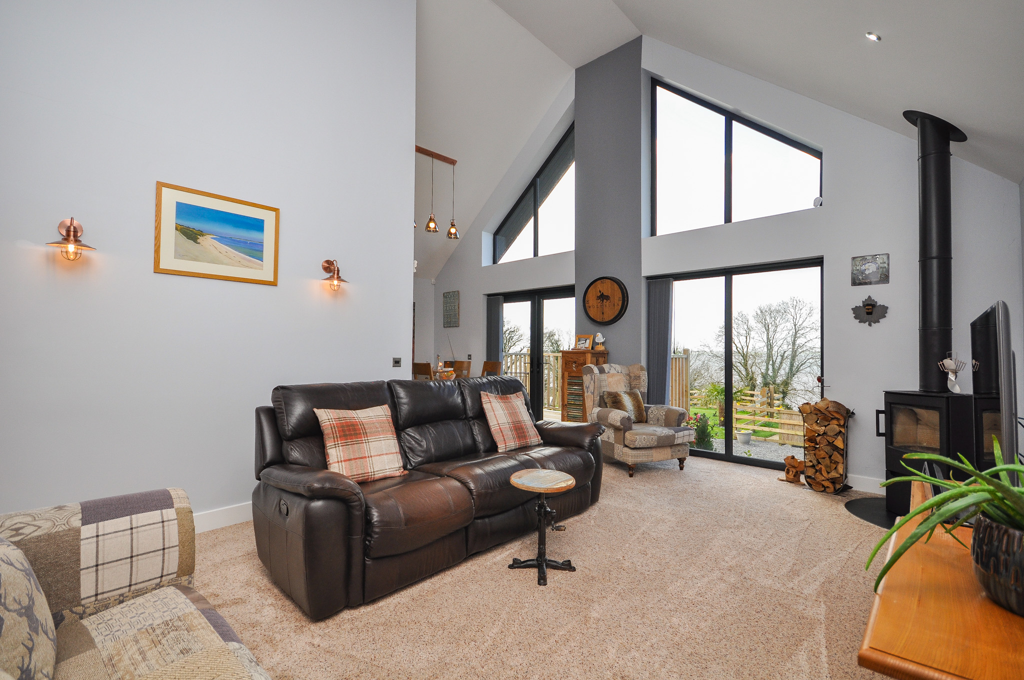 The heart of the home is the impressive open-plan living space, featuring a stunning vaulted ceiling and full-height glazing to the front elevation, framing the outlook and flooding the interior with natural light. A stylish freestanding wood-burning stove provides a cosy focal point, creating a welcoming yet contemporary atmosphere. The living area flows seamlessly into the dining space, which enjoys direct access to the outside, making the layout ideal for both everyday family living and entertaining.