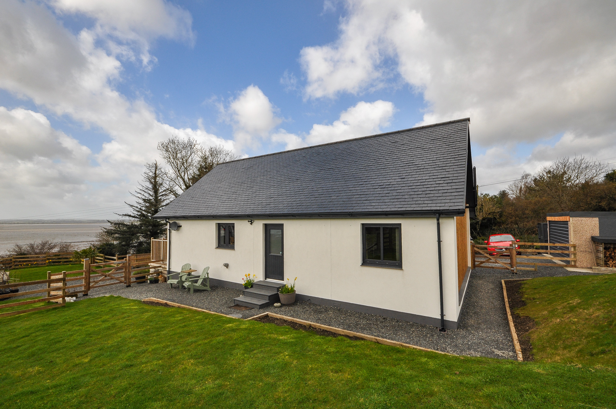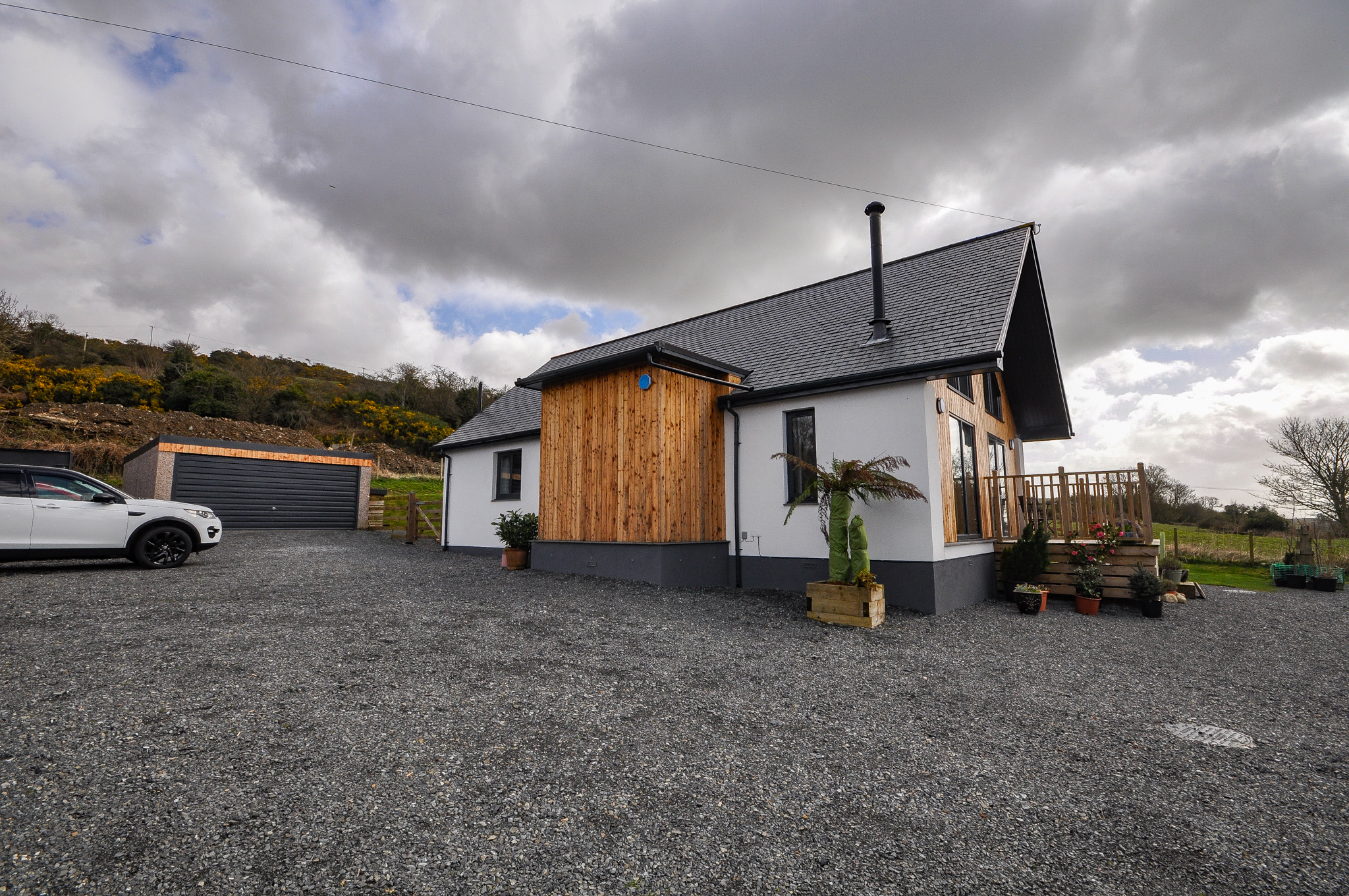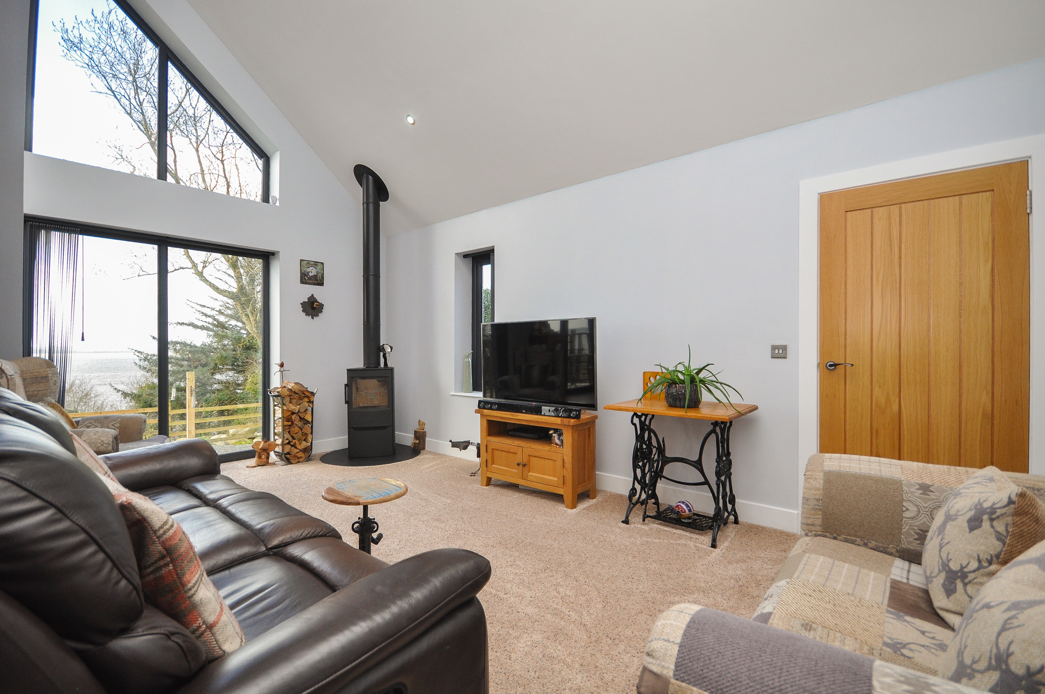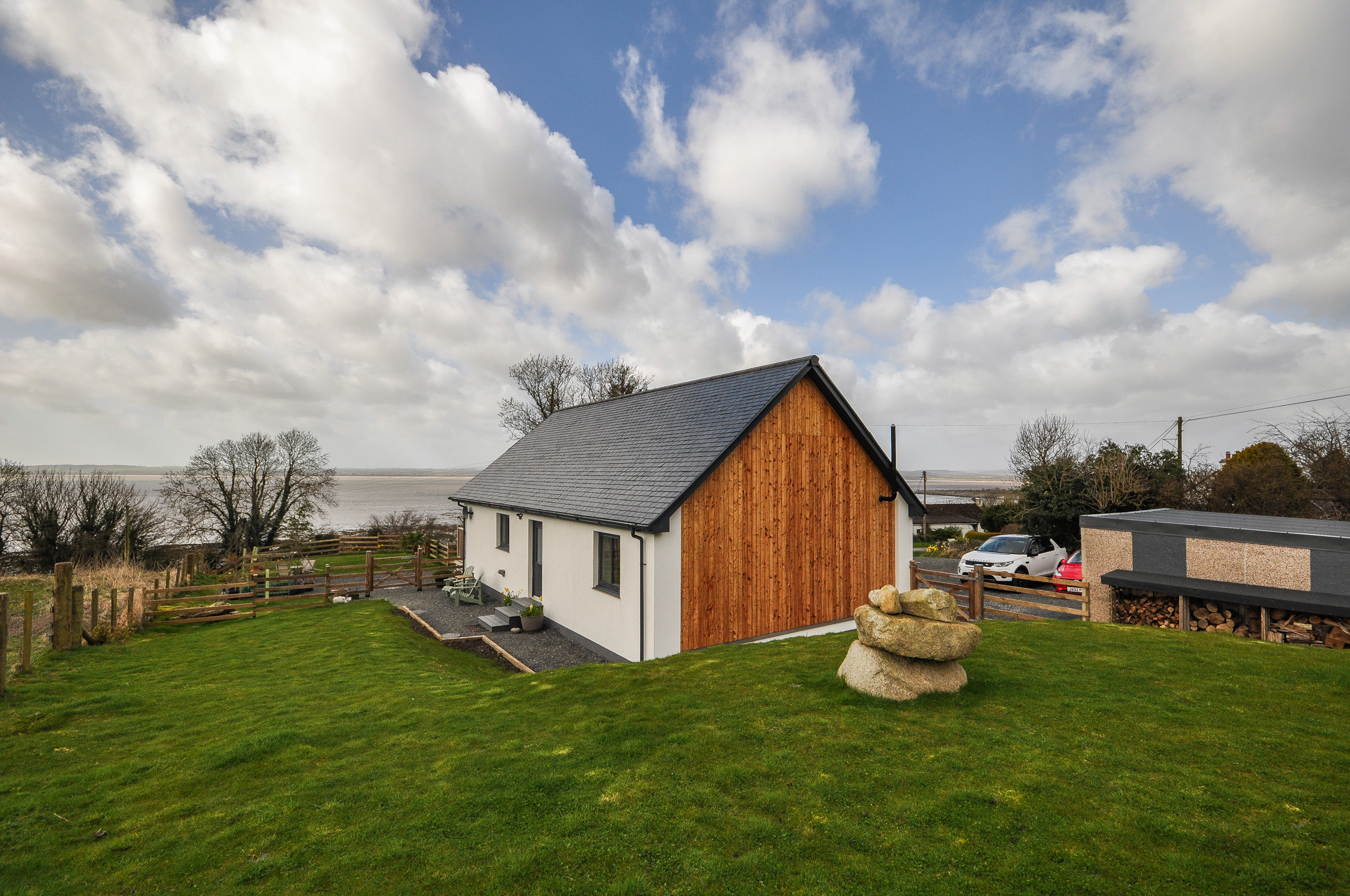 An individually architect-designed modern home, positioned to take full advantage of its elevated setting with attractive open outlooks towards the surrounding countryside and water. Designed with both style and efficiency in mind, the property benefits from modern eco-conscious construction methods including high levels of insulation and extensive glazing, maximising natural light while enhancing heat retention and energy efficiency. The striking exterior combines contemporary render with timber cladding, creating a distinctive and appealing finish.