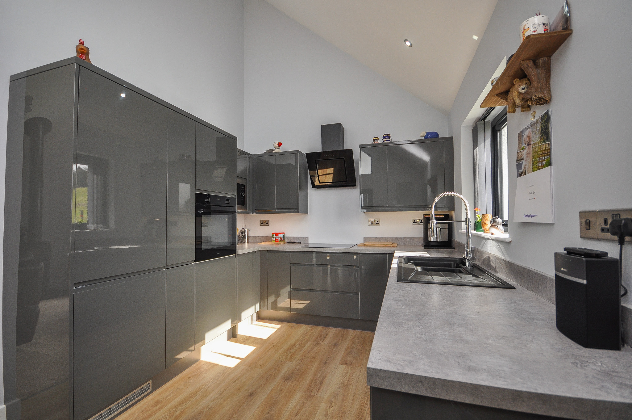 The modern fitted kitchen is finished with high-gloss units complemented by contrasting work surfaces and integrated appliances, providing ample storage and preparation space. A separate utility room offers further fitted units, worktop space, sink and room for laundry appliances, along with convenient external access.